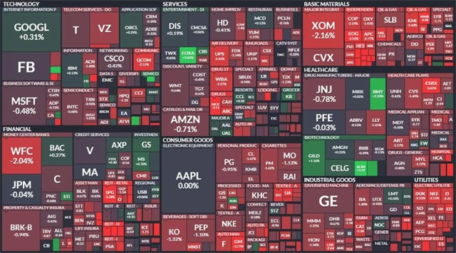 V indexu Dow nejvýrazněji zlevnily akcie výrobce těžké stavební a těžební techniky Caterpillar (-2,37 %), ropné společnosti ExxonMobil (-2,16 %) a výrobce letadel Boeing (-1,4 %). V plusu skončilo pouze šest titulů, zpevnily akcie banky Goldman Sachs (+0,58 %), kartové firmy American Express (+0,31 %), zábavní společnosti Walt Disney (+0,19 %), počítačového obra IBM (+0,13 %), řetězce restaurací s rychlým občerstvením McDonald's (+0,13 %) a farmaceutické firmy Merck (+0,02 %). Akcie technologické firmy Apple zůstaly na nule.