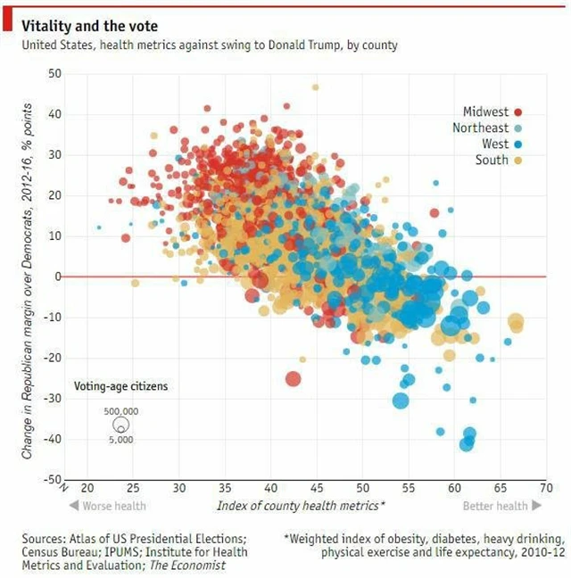 Někteří lidé se stále nepřestávají ptát, jak se to jen mohlo stát. Ano, řeč je stále o vítězství Donalda Trumpa v amerických prezidentských volbách. S dalším možným vysvětlením přišel The Economist. Trumpovi dali ve větší míře hlas lidé s horším zdravím. Těch "čipernějších" bylo sice více, vzhledem k systému voleb lze ale říci, že zkrátka žijí ve špatných státech.