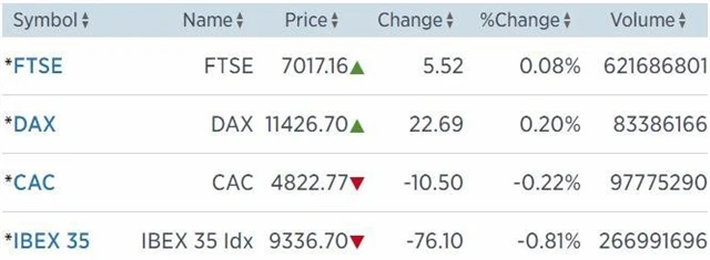 Britský FTSE 100 zpevnil o 0,08 % na 7 017,16 bodu, francouzský CAC 40 odepsal 0,22 % na 4 822,77 bodu a německý index DAX stoupl o 0,2 % na 11 426,70 bodu.