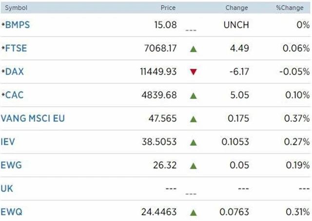 Regionální index STOXX Europe 600 uzavřel na zelené nule, se ziskem 0,04 % skončil na 359,98 bodu (za celý týden -0,01 %), když jeho sektory uzavřely smíšeně. Britský FTSE 100 zpevnil o 0,06 % na 7 068,17 bodu (za celý týden +0,8 %), francouzský CAC 40 si připsal 0,1 % na 4 839,68 bodu (za celý týden +0,13 %) a německý index DAX odepsal 0,05 % na 11 449,93 bodu (za celý týden +0,4 %).