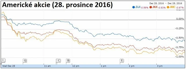 Dow klesl o 0,56 % na 19 833,68 bodu, během dne se přitom index přiblížil na 19 bodů k úrovni 20 000 bodů. Širší index S&P 500 oslabil o 0,84 % na 2 249,92 bodu a index technologického trhu Nasdaq Composite uzavřel se ztrátou 0,89 % na 5 438,56 bodu.