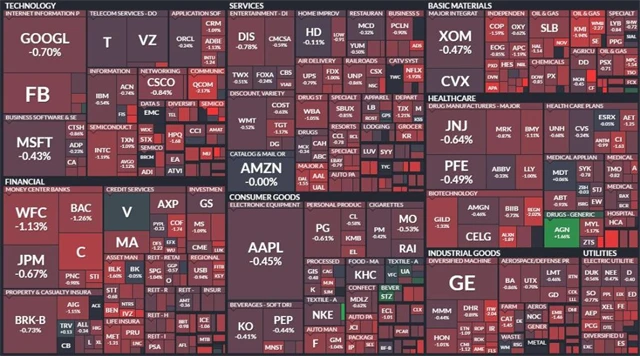 V červených číslech skončilo všech jedenáct hlavních sektorů indexu S&P 500. Nejvýraznější pokles zaznamenaly sektor základních materiálů, průmyslové odvětví a energetický sektor. Relativně nejlépe si vedl sektor necyklického spotřebního zboží.