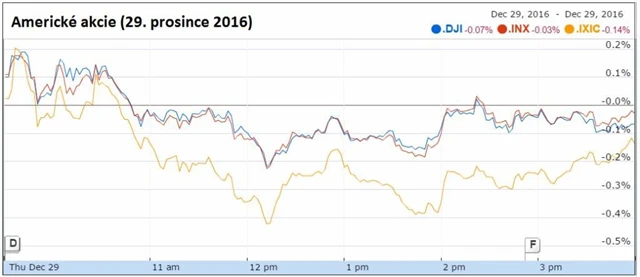 Americké akcie zahájily čtvrteční seanci mírným růstem, ze zelených čísel se ale poměrně rychle svezly pod nulu. Aktivita na trhu byla před koncem roku utlumená. Nepřijde-li v pátek na Wall Street rally, což lze dle většiny analytiků označit prakticky za vyloučené, hodnota 20 000 bodů indexu Dow už letos pokořena nebude.