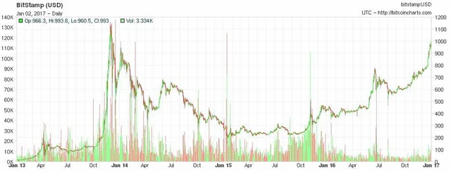 Hodnota kybernetické měny bitcoin se během pondělního obchodování poprvé za tři roky vyšplhala nad hranici 1 000 dolarů. Pokračuje tak v růstu poté, co v loňském roce posílila o 125 %.