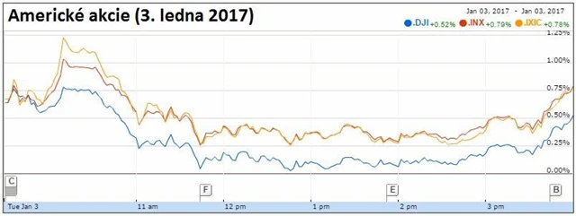 Akcie v USA zahájily po prodlouženém víkendu rok 2017 smělým růstem, většinu z více než procentních zisků ovšem poměrně rychle odevzdaly a pohybovaly se poté jen lehce nad nulou. V závěru ale všechny tři hlavní indexy zabraly a zisky znovu rozšířily. Zajímavým vývojem prošel trh s ropou - ceny černého zlata nejdříve vystoupaly na 16měsíční maxima, později ale zisky odevzdaly a spadly výrazně pod nulu. V pondělí byly americké burzy kvůli nahrazování nedělního státního svátku zavřené.