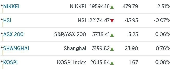 Nejvýraznější vzestup zaznamenal hlavní index tokijské burzy Nikkei 225, jenž přidal více než dvě a půl procenta poté, co trh zaznamenal oživení tamního zpracovatelského sektoru. Konečný údaj prosincového indexu nákupních manažerů dosáhl hodnoty 52,4 bodu, což překonalo předběžný údaj 51,9 bodu i listopadových 51,3 bodu.