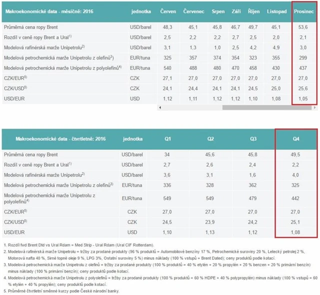 Za celé čtvrté čtvrtletí činil rozdíl v ceně ropy Brent a Ural 2,2 USD na barel (3. čtvrtletí: 2,4 USD), modelová rafinérská marže dosáhla 4 USD na barel (3. čtvrtletí: 1,6 USD), marže z olefinů byla 325 eur na tunu (3. čtvrtletí: 362 eur) a marže z polyolefinů dosáhla 442 eur na tunu (3. čtvrtletí: 479 eur).