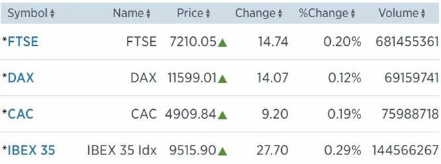 Britský FTSE 100 si připsal 0,2 % na 7 210,05 bodu (za celý týden +1,92 %), francouzský CAC 40 zpevnil o 0,19 % na 4 909,84 bodu (za celý týden +0,97 %) a německý index DAX stoupl o 0,12 % na 11 599,01 bodu (za celý týden +1,03 %).