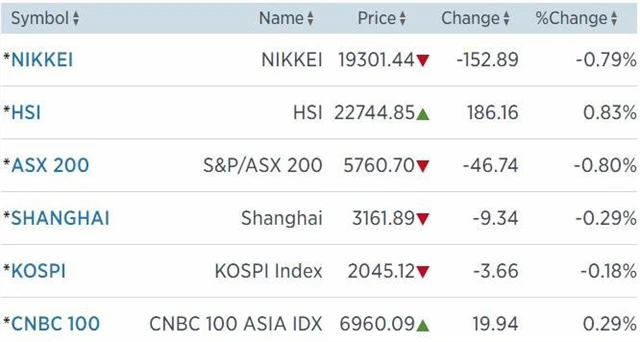 Jihokorejský Kospi klesl o 0,18 %, hongkongský Hang Seng však šel proti trendu a vyskočil o 0,83 %. Nedařilo se čínským akciím. Shanghai Composite odepsal 0,3 %, menší Shenzhen Composite přišel o 0,24 %. Prosincový index spotřebitelských cen v Číně se podle úterních dat meziročně snížil na 2,1 % z 2,3 % v listopadu, meziměsíčně pak vzrostl na +0,2 % oproti +0,1 % v předchozím měsíci. Index výrobních cen se ve stejném měsíci meziročně dostal na +5,5 % z +3,3 % v listopadu.