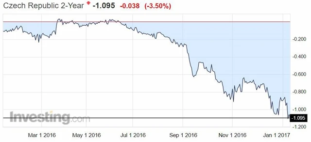 V pondělí se dvouletý český vládní dluhopis obchodoval s výnosem pod -1 %. Český krátkodobý vládní dluh je tak prakticky nejníže úročeným dluhem na světě. Konkuruje nám již pouze Švýcarsko. Výnos českého vládního dluhu je přitom o to absurdnější, že inflace roste.
