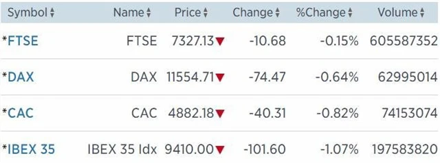 Kvůli obavám z brexitu v pondělí klesaly i výnosy evropských dluhopisů a s tím celý finanční sektor. Regionální index STOXX Europe 600 odepsal 0,81 % na 362,97 bodu, když téměř všechny jeho sektory uzavřely v červených číslech. Britský FTSE 100 sice v úvodu díky oslabující libře vytvořil nové historické maximum 7 354,14 bodu, obchodování však zakončil se ztrátou 0,15 % na 7 327,13 bodu. Francouzský CAC 40 odevzdal 0,82 % na 4 882,18 bodu a německý index DAX přišel o 0,64 % na 11 554,71 bodu.