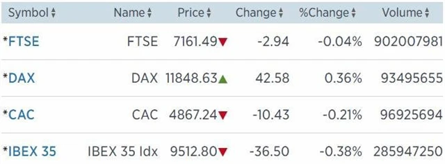Britský FTSE 100 uzavřel se ztrátou 0,04 % na 7 161,49 bodu, francouzský CAC 40 klesl o 0,21 % na 4 867,24 bodu a německý index DAX zpevnil o 0,36 % na 11 848,63 bodu.