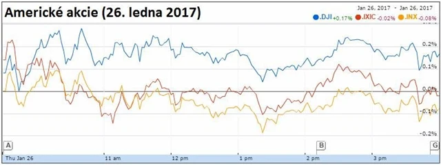 Index Dow, který se ve středu poprvé v historii dostal nad úroveň 20 000 bodů, ve čtvrtek uzavřel se ziskem 0,16 % na 20 100,91 bodu, širší S&P 500 nakonec klesl o 0,07 % na 2 296,68 bodu a index technologického trhu Nasdaq Composite se snížil o 0,02 % na 5 655,18 bodu. Absolutní maximum posunul Dow na 20 125,58 bodu, S&P 500 na 2 300,99 bodu a Nasdaq Composite na 5 669,61 bodu.
