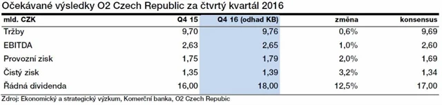 Telekomunikační firma O2 Czech Republic podle analytiků vykáže za celý loňský rok výsledky hospodaření v souladu s prognózou managementu. Výsledky podle nich podpořil zejména segment mobilních internetových dat. Podle Jana Šumbery z České spořitelny by společnost měla vyplatit dividendu a část z emisního ážia indikující dividendový výnos nad 7 %. O2 zveřejní čísla za poslední loňské čtvrtletí a celý rok v úterý ráno.