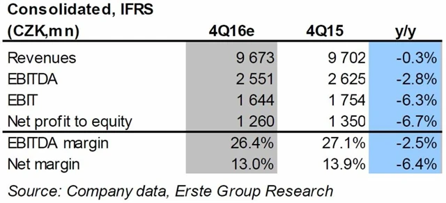 Management firmy v posledním výhledu odhadl provozní zisk EBITDA za celý rok 2016 na 10,4 až 10,7 miliardy Kč, na úrovni čistého zisku pak firma čeká celoroční výsledek 5,1 až 5,4 miliardy Kč.