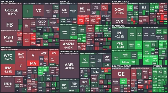 Index Dow nakonec klesl o 0,54 % na 19 864,09 bodu a širší S&P 500 odepsal 0,09 % na 2 278,87 bodu. Index technologického trhu Nasdaq Composite posílil o 0,02 % na 5 614,79 bodu. Index volatility VIX vzrostl o 0,93 % na 11,99 bodu a výnos 10letých vládních dluhopisů USA klesl o téměř tři bazické body na 2,46 %.