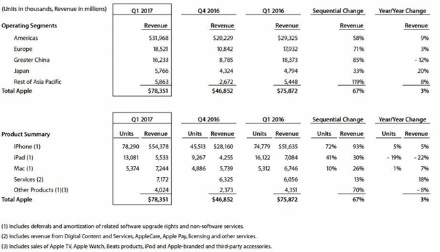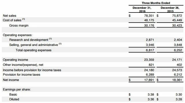 Firma oznámila, že v posledních třech měsících roku 2016 dosáhla upraveného zisku na akcii 3,38 USD nad odhadem trhu 3,22 USD. O rok dříve vykázala za stejné období zisk na akcii očištěný o mimořádné položky na úrovni 3,28 USD. Celkové tržby firmě ve čtvrtletí meziročně stouply na 78,4 miliardy USD, trh přitom čekal, že se zvýší jen na 77,4 miliardy USD ze 75,87 miliardy USD. Poslední tři měsíce roku 2016 pro Apple byly z hlediska tržeb dokonce historicky nejlepším čtvrtletím.