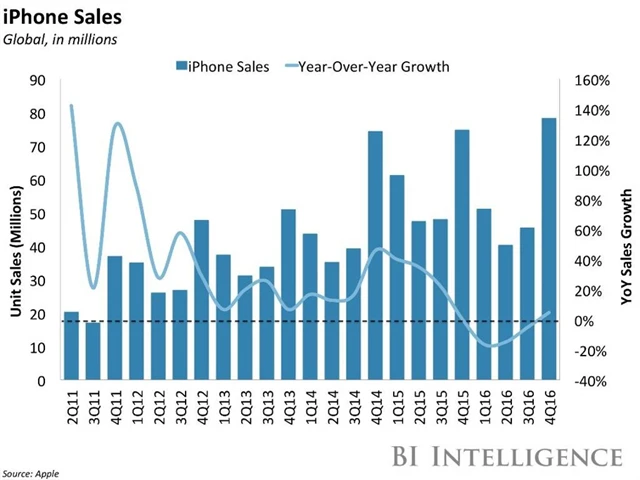 Očekávání trhu společnost porazila i na rovině prodaných iPhonů, které zajišťují asi dvě třetiny jejích celkových příjmů. Firma uvedla, že v období od října do prosince prodala 78,3 milionu iPhonů, trh čekal asi 76 milionů kusů prodaných iPhonů po 74,8 milionu v posledním kalendářním čtvrtletí roku 2015. Prodej iPhonů byl stejně jako tržby rekordní. Průměrná prodejní cena iPhonu se meziročně zvýšila z 691 USD na rekordních 695 USD, analytici přitom čekali pokles na 688 USD. V posledních třech čtvrtletích prodeje iPhonů klesaly, nyní ale společnost kvůli silnému zájmu o iPhone 7 Plus dokonce údajně měla problémy se zásobováním trhu.