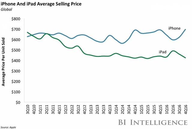 Jak upozorňuje například Mark Moskowitz, analytik z Barclays, pro Apple je stále těžší své zákazníky přesvědčit, aby starší funkční iPhony nahrazovali novými přístroji. Ačkoli jsou tak nové modely dražší než jejich předchůdci, průměrná prodejní cena telefonů klesá. Důvod je prostý - část uživatelů si raději kupuje levnější přístroje ze starších modelových řad, protože nevidí přidanou hodnotu vlajkových lodí (aktuálně iPhone 7 a iPhone 7 Plus).