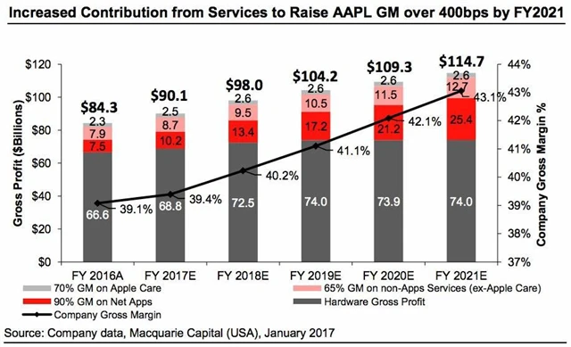 Podle analytiků ze společnosti Macquarie Research by rok 2017 pro Apple mohl být v mnoha ohledech bodem zlomu. Jejich odhady totiž naznačují, že se Applu začne znovu zvyšovat hrubá marže a do roku 2021 se dostane nad 43 %, mimo jiné právě díky expanzi segmentu služeb. Na konci roku 2016 hrubá marže Applu klesla meziročně z 40,1 % na 38,5 %, čekal se pokles na 38,4 %.