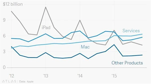 Mnohé si trh ještě nedávno sliboval od prodeje tabletů iPad a hodinek Apple Watch. Tyto naděje ovšem berou zasvé. Prodeje iPadů dlouhodobě padají a poptávka po chytrých hodinkách, jež společnost v rámci hospodářských výsledků zařazuje do kategorie "ostatní", je spíše vlažná.