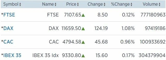 Britský FTSE 100 zpevnil o 0,12 % na 7 107,65 bodu, francouzský CAC 40 si připsal 0,96 % na 4 794,58 bodu a německý index DAX si polepšil o 1,08 % na 11 659,50 bodu.