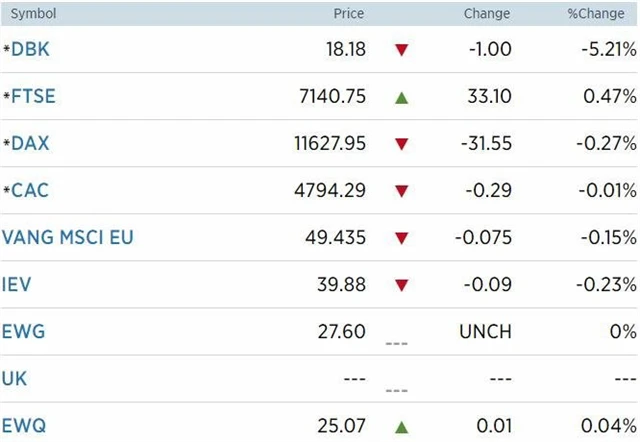 Evropské burzy ve čtvrtek převážně klesly, akcie Deutsche Bank se propadly o více než 5 %