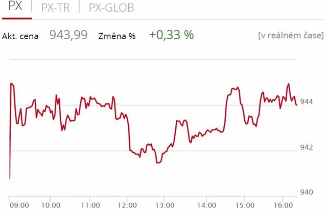 Pražská burza v pátek počtvrté v řadě zpevnila, když index PX vzrostl o 0,33 % na 943,99 bodu. Nahoru burzu táhly akcie operátora O2 Czech Republic, nedařilo se likérce Stock Spirits. Objem obchodů byl se 408 miliony korun podprůměrný. Za celý týden index PX vzrostl o 0,8 %.