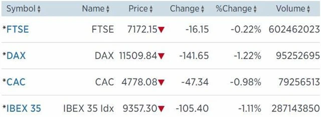 Britský FTSE 100 přišel o 0,22 % na 7 172,15 bodu, francouzský CAC 40 klesl o 0,98 % na 4 778,08 bodu a německý index DAX odevzdal 1,22 % na 11 509,84 bodu.