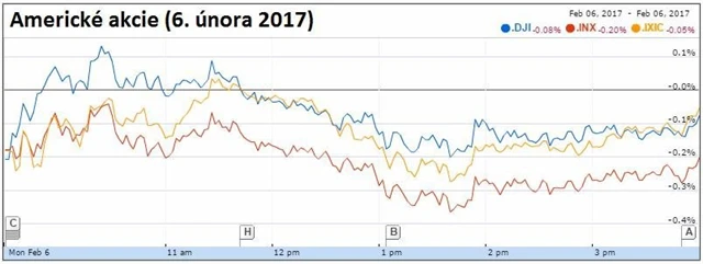 Americké akcie během pondělní seance mírně oslabily. Energetické podniky se dostaly pod tlak kvůli nižším cenám ropy, na akciovém trhu navíc přetrvává nejistota ohledně hospodářské politiky nového prezidenta Spojených států Donalda Trumpa.