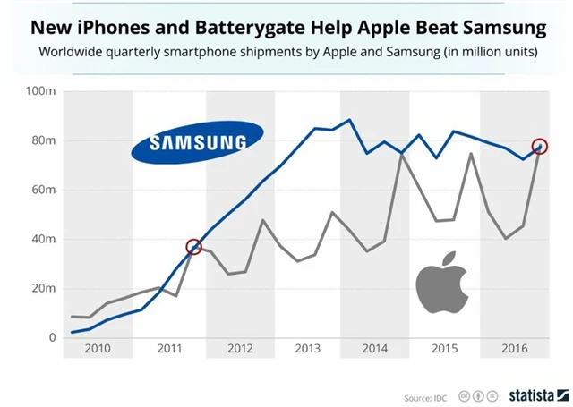 Americká technologická společnost Apple na konci loňského roku poprvé po pěti letech prodala víc chytrých mobilních telefonů než její jihokorejský konkurent Samsung. Vyplývá to z údajů průzkumné agentury IDC. Applu se dařilo díky nové generaci iPhonů, prodeje Samsungu naopak tlumila kauza "vybuchujících" baterií phabletů Galaxy Note 7.