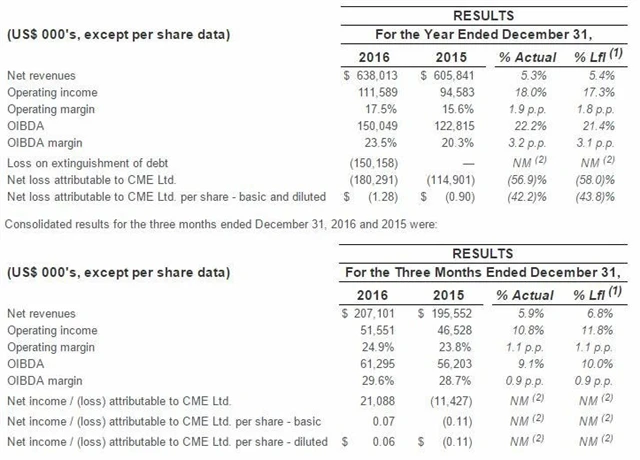 Za celý rok firmě výnosy vzrostly o 5,3 % na 638,01 milionu USD (bez FX +5,4 %), celoroční zisk OIBDA se loni zvýšil o 22,2 % na 150,05 milionu USD (bez FX +21,4 %) a OIBDA marže se proti konci roku 2015 zvýšila z 20,3 % na 23,5 %. Trh s reklamou loni podle CME v zemích, kde působí, vzrostl o 6 %, její příjmy z reklamy se zvýšily při konstantních kurzech měn o 5 %, růst táhly Česká republika, Rumunsko a Slovensko.