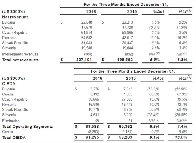 Tržby se firmě ve čtvrtém čtvrtletí zvýšily meziročně o 5,9 % na 207,1 milionu USD (bez vlivu změn měnových kurzů +6,8 %), zisk OIBDA se společnosti zvýšil o 9,1 % na 61,3 milionu USD (bez FX +10 %) a OIBDA marže stoupla z 28,7 % na 29,6 %.