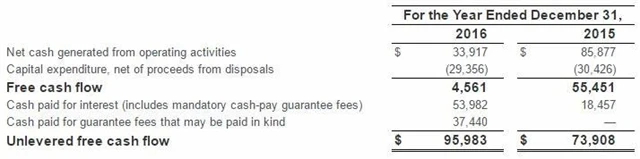 Volné cash flow nezatížené úroky a garančními poplatky se loni meziročně zvýšilo na 95,98 milionu USD ze 73,91 milionu USD. Na garančních poplatcích firma zaplatila 37,44 milionu USD a na úrocích 53,98 milionu USD. Volné cash flow po odečtení úroků a garančních poplatků tak bylo 4,56 milionu USD (o rok dříve 55,45 milionu USD).