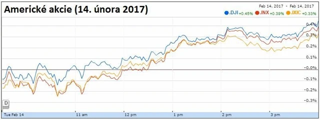 Dow vzrostl o 0,45 % na nové zavírací maximum 20 504,41 bodu, S&P 500 stoupl o 0,4 % na nové zavírací maximum 2 337,58 bodu a index technologického trhu Nasdaq Composite se zvýšil o 0,32 % na nové zavírací maximum 5 782,57 bodu. Pro indexy Dow a S&P 500 jsou nová zavírací maxima zároveň také novými absolutními maximy, Nasdaq Composite své absolutní maximum posunul na 5 783,09 bodu.