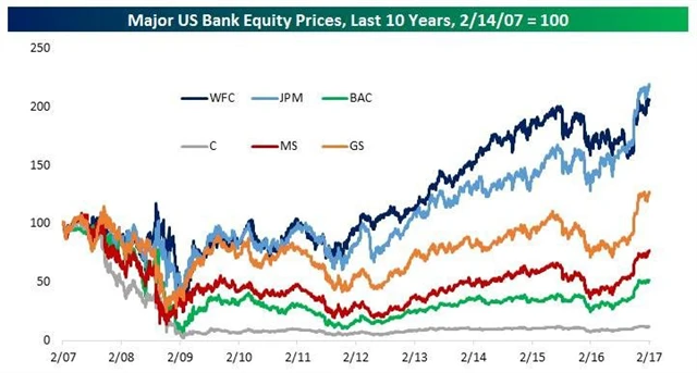 Souhrnná tržní kapitalizace těchto šesti amerických bank dosahuje 1,197 bilionu dolarů, před krizí to bylo 995 miliard dolarů a po prudkém propadu z roku 2008 jen 179 miliard dolarů.