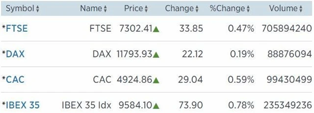 Britský FTSE 100 stoupl o 0,47 % na 7 302,41 bodu, francouzský CAC 40 získal 0,59 % na 4 924,86 bodu a německý DAX si připsal 0,19 % na 11 793,93 bodu.