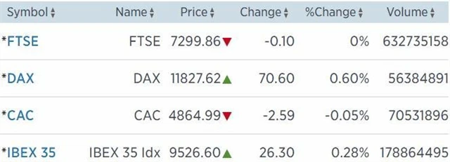 Regionální index STOXX Europe 600 během dne kolísal mezi zelenými a červenými čísly, nakonec uzavřel se ziskem 0,22 % na 371,04 bodu. Britský FTSE 100 uzavřel na nule, francouzský CAC 40 odevzdal 0,05 % a německý index DAX stoupl o 0,6 %.