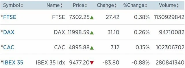 Regionální index STOXX Europe 600 se snížil o 0,01 % na 373,38 bodu, britský FTSE 100 zpevnil o 0,38 % na 7 302,25 bodu, CAC 40 stoupl o 0,15 % na 4 895,88 bodu a německý DAX si připsal 0,26 % na 11 998,59 bodu.