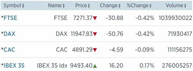 Regionální index STOXX Europe 600 klesl o 0,14 % na 372,85 bodu, když všechny velké burzy uzavřely v mínusu. Britský FTSE 100 odepsal 0,42 % na 7 271,37 bodu, francouzský CAC 40 přišel o 0,09 % na 4 891,29 bodu a německý DAX ztratil 0,42 % na 11 947,83 bodu.