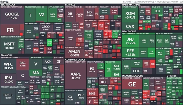 Dow navýšil své zavírací maximum o 0,17 % na 20 810,32 bodu, S&P 500 v závěru uhájil mírný zisk 0,04 % na 2 363,81 bodu, zatímco Nasdaq Composite odepsal 0,43 % na 5 835,51 bodu. Zisky okolo půl procenta si připsala odvětví energetiky, zdravotní péče nebo necyklického spotřebního zboží, ztrácely naopak technologie a nejvýrazněji sektor základních materiálů. Index volatility VIX klesl o 0,17 % na 11,72 bodu a výnos 10letých vládních dluhopisů USA klesl o necelé čtyři bazické body na 2,3738 %.