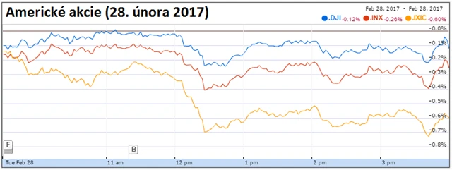 Za celý únor jsou ale všechny tři indexy v plusu. Dow Jonesův index si připsal 4,8 %, S&P 500 zpevnil o 3,7 % a Nasdaq Composite má k dobru 3,75 %.
