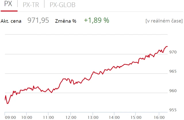 Pražská burza se ve středu odrazila od ztrát z předcházejících seancí, když index PX zpevnil o 1,89 % na 971,95 bodu, a vzrostl tak nejvíc od loňského července. Nahoru burzu táhly finanční tituly, v červených číslech uzavřeli pouze telefonní operátor O2 Czech Republic, textilka Pegas Nonwovens a likérka Stock Spirits. Objem obchodů byl s 871 miliony korun nadprůměrný.