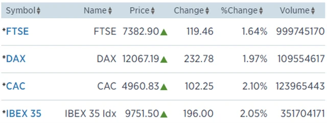 Britský FTSE 100 vzrostl o 1,64 % na 7 382,9 bodu, francouzský CAC 40 si připsal 2,1 % na 4 960,83 bodu a německý DAX zpevnil o 1,97 % na 12 067,19 bodu. Všechny tři indexy v průběhu středečního obchodování posunuly svá historická maxima.