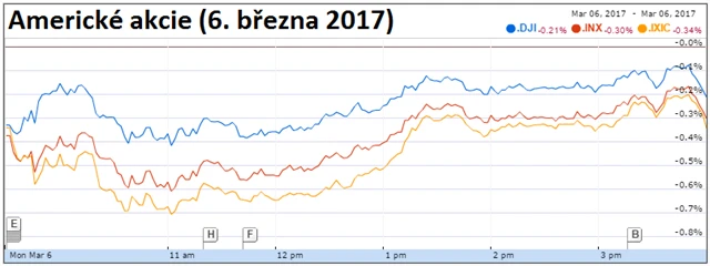 Dow v pondělí nakonec klesl o 0,24 % na 20 954,34 bodu, širší S&P 500 odepsal 0,33 % na 2 375,31 bodu a index technologického trhu Nasdaq Composite uzavřel se ztrátou 0,37 % na 5 849,17 bodu.