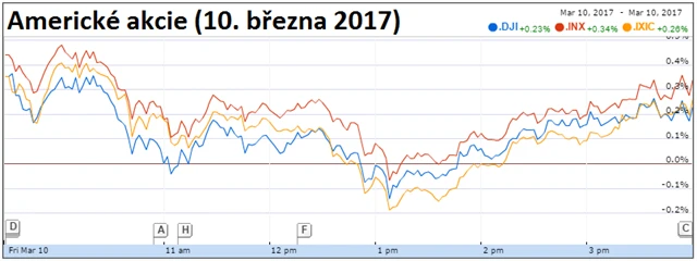 Index Dow v pátek stoupl o 0,21 % na 20 902,98 bodu, širší S&P 500 posílil o 0,33 % na 2 372,60 bodu a index technologického trhu Nasdaq Composite se zvýšil o 0,39 % na 5 861,73 bodu. Index volatility VIX v pátek klesl o 5,2 % na 11,66 bodu a výnos 10letých vládních dluhopisů USA se snížil o tři bazické body na 2,574 %.