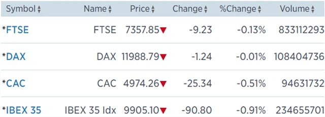 Regionální index STOXX Europe 600 klesl o 0,31 % na 373,46 bodu, když v negativním pásmu skončila většina jeho sektorů. Britský FTSE 100 se snížil o 0,13 % na 7 357,85 bodu, francouzský CAC 40 ztratil 0,51 % na 4 974,26 bodu a německý index DAX odepsal 0,01 % na 11 988,79 bodu.