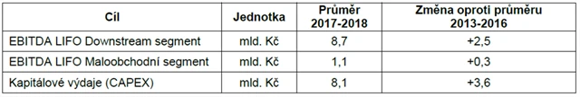 Unipetrol - finanční cíle pro roky 2017 a 2018, zdroj: Unipetrol