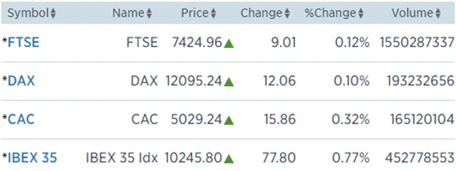 Britský benchmark FTSE 100 v pátek vytvořil nové historické maximum 7 447 bodů, uzavřel však se ziskem 0,12 % na 7 424,96 bodu (za celý týden +1,05 %). Francouzský CAC 40 si připsal 0,32 % na 5 029,24 bodu (za celý týden +0,51 %) a německý index DAX vzrostl o 0,1 % na 12 095,24 bodu (za celý týden +1,1 %).