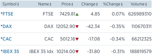 Britský FTSE 100 zpevnil o 0,07 % na 7 429,81 bodu, francouzský CAC 40 odevzdal 0,34 % na 5 012,16 bodu a německý index DAX ztratil 0,35 % na 12 052,9 bodu.